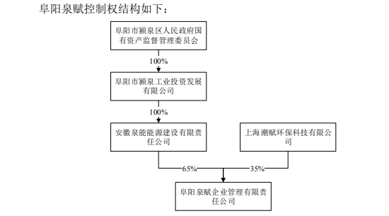 股權(quán)結(jié)構(gòu)顯示,阜陽泉賦由安徽泉能能源建設(shè)有限責(zé)任公司持股65%,上海潮賦環(huán)??萍加邢薰境止?5%。而泉能能建由阜陽市潁泉工業(yè)投資發(fā)展有限公司100%控股,而潁泉投資又由阜陽潁泉國資委100%控股。
