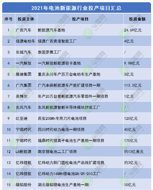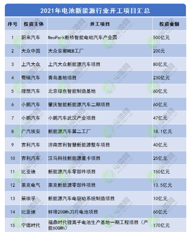 電池網(wǎng)(微號(hào):mybattery)根據(jù)上市公司公告及公開(kāi)報(bào)道梳理了2021年電池新能源產(chǎn)業(yè)鏈項(xiàng)目開(kāi)工投產(chǎn)情況發(fā)現(xiàn),在頭部企業(yè)的帶領(lǐng)下,新能源產(chǎn)業(yè)鏈企業(yè)擴(kuò)產(chǎn)步伐較去年相比進(jìn)一步加速。