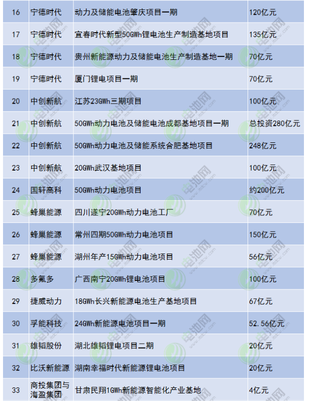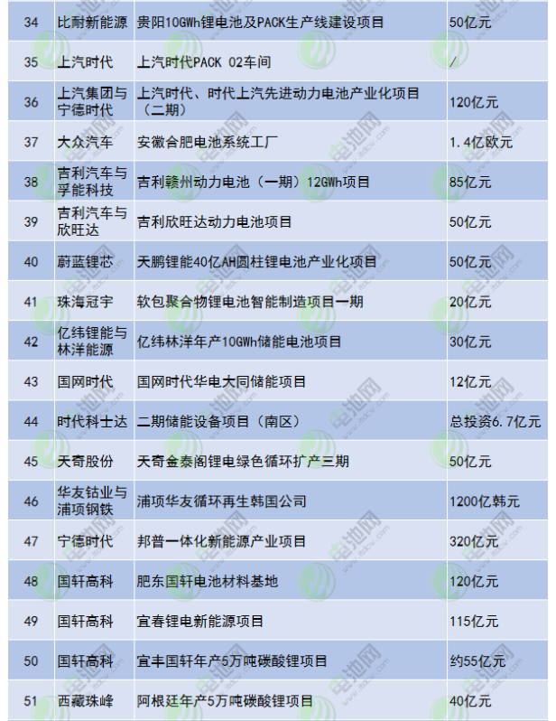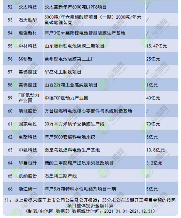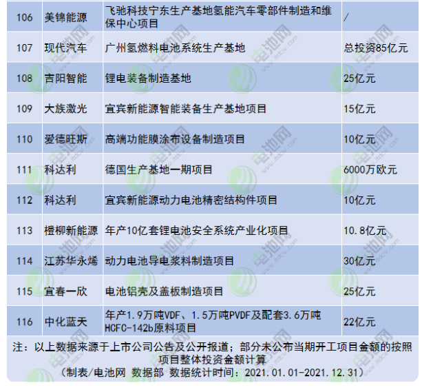 此外,2021年,統(tǒng)計(jì)在內(nèi)的66個(gè)電池新能源行業(yè)投產(chǎn)項(xiàng)目,39個(gè)公布投資金額,投資總額約1434.19億元,平均投資約36.77億元。其中,新能源車項(xiàng)目8個(gè),6個(gè)公布投資金額,投資總額約155.97億元;鋰電池項(xiàng)目20個(gè),13個(gè)公布投資金額,投資總額約678.09億元。(部分未公布當(dāng)期開(kāi)工投產(chǎn)項(xiàng)目金額的按照項(xiàng)目整體投資金額計(jì)算)