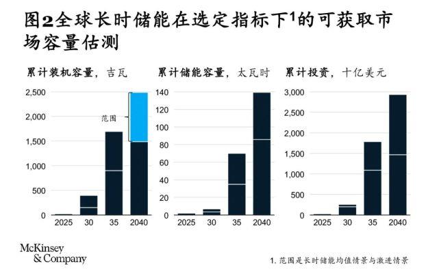 不過(guò),這一切才剛起步。麥肯錫的建模研究結(jié)果表明,到2040年,全球部署的長(zhǎng)時(shí)儲(chǔ)能裝機(jī)容量有望達(dá)到1.5~2.5太瓦(TW),這是目前全球部署的儲(chǔ)能系統(tǒng)總裝機(jī)容量的8~15倍。同樣,到2040年,長(zhǎng)時(shí)儲(chǔ)能行業(yè)可以部署85~140太瓦時(shí)(TWh)的儲(chǔ)能容量,并且儲(chǔ)存高達(dá)總用電量10%的電能。這對(duì)應(yīng)了1.5~3萬(wàn)億美元的累計(jì)投資(見圖2)。