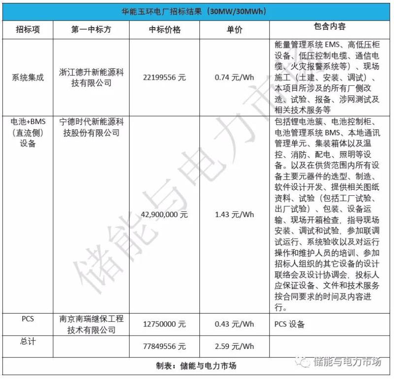 玉環(huán)電廠火儲(chǔ)聯(lián)合調(diào)頻項(xiàng)目,系統(tǒng)集成中標(biāo)價(jià)格2220萬(wàn)元,電池直流側(cè)設(shè)備中標(biāo)價(jià)格4290萬(wàn)元,PCS設(shè)備中標(biāo)價(jià)格1275萬(wàn)元,折合總系統(tǒng)造價(jià)約2.59元/Wh。