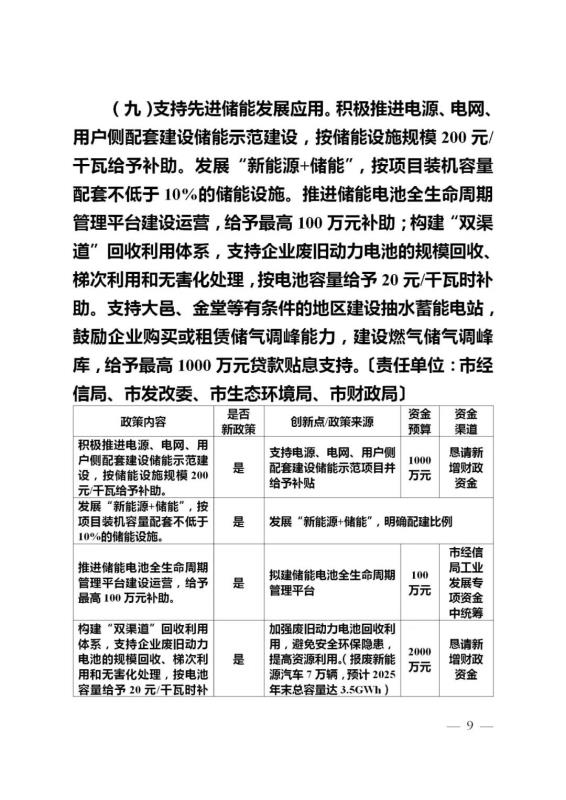 中國儲能網(wǎng)訊:1月6日,成都市經(jīng)濟和信息化局發(fā)布關于公開征求《成都市能源結構調(diào)整十條政策措施》意見建議的通知。建議指出支持先進儲能發(fā)展應用。積極推進電源、電網(wǎng)、用戶側配套建設儲能示范建設,按儲能設施規(guī)模200元/千瓦給予補助。發(fā)展“新能源+儲能”,按項目裝機容量配套不低于10%的儲能設施。推進儲能電池全生命周期管理平臺建設運營,給予最高100萬元補助;構建“雙渠道”回收利用體系,支持企業(yè)廢舊動力電池的規(guī)?;厥铡⑻荽卫煤蜔o害化處理,按電池容量給予20元/千瓦時補助。支持大邑、金堂等有條件的地區(qū)建設抽水蓄能電站,鼓勵企業(yè)購買或租賃儲氣調(diào)峰能力,建設燃氣儲氣調(diào)峰庫,給予最高1000萬元貸款貼息支持。