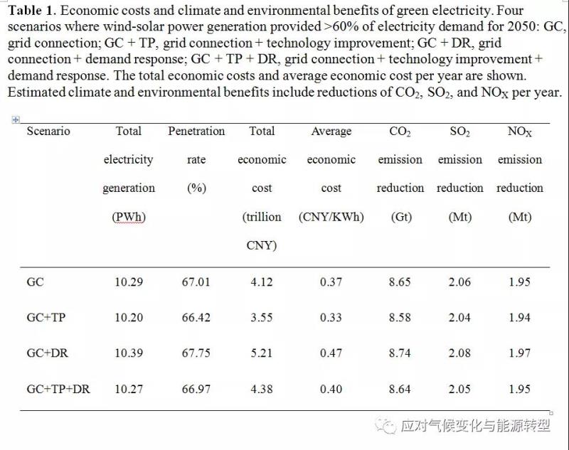 表1、風光綠色電力帶來的經(jīng)濟成本和氣候環(huán)境指標的差異