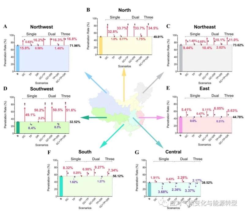 接下來,研究考慮了三種促進風能-太陽能利用的策略(即區(qū)域電網(wǎng)互聯(lián)、技術(shù)進步和需求響應),并量化了它們對風能-太陽能滲透率的潛在影響。區(qū)域電網(wǎng)互聯(lián)情景意味著,模型考慮連接區(qū)域電網(wǎng)(如西北電網(wǎng))內(nèi)的省域電網(wǎng),并在區(qū)域電網(wǎng)尺度上進行空間優(yōu)化和模型求解;就技術(shù)進步情景而言,我們提高風機輪轂高度,即使用140m高度的風機替代100m高度的風機;同時,采用跟蹤式光伏支架替代固定式光伏支架。已有研究表明,與固定式光伏支架相比,采用跟蹤式光伏支架,可以提高20%-40%的光伏發(fā)電量。就需求響應情景而言,我們在需求側(cè)調(diào)整負荷曲線,使其更好地與新能源供給曲線相匹配。具體地,我們將需求響應的潛力設為10%。我們評估了每種策略的影響,以及多種策略組合的綜合影響,共計8種情景。