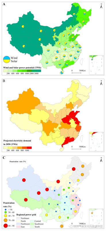 圖1、中國風電光伏發(fā)電潛力、2050年各省用電需求以及2050年中國不同省份的風光滲透率