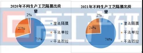 從隔膜產(chǎn)品結(jié)構(gòu)來(lái)看,2021年中國(guó)鋰電隔膜市場(chǎng)出貨仍以濕法隔膜為主,市場(chǎng)占比74%。濕法隔膜市場(chǎng)占比提升的原因?yàn)椋?)下游對(duì)性能要求逐步提升,濕法隔膜厚度更薄,可提高鋰電池能量密度;2)下游需求旺盛,行業(yè)供求偏緊,濕法隔膜產(chǎn)能投放大于干法隔膜,推動(dòng)濕法隔膜出貨量。2021年干法占比雖有所減少,但其出貨量保持快速增長(zhǎng),主要受儲(chǔ)能、小動(dòng)力電池增長(zhǎng)帶動(dòng)。