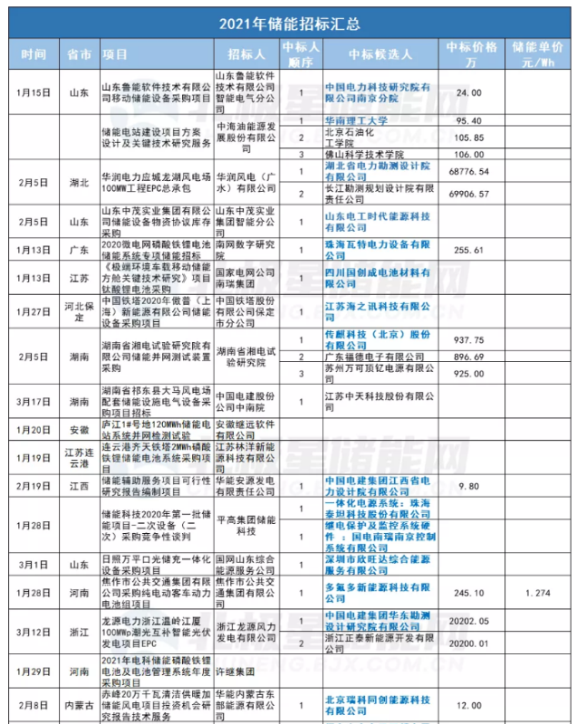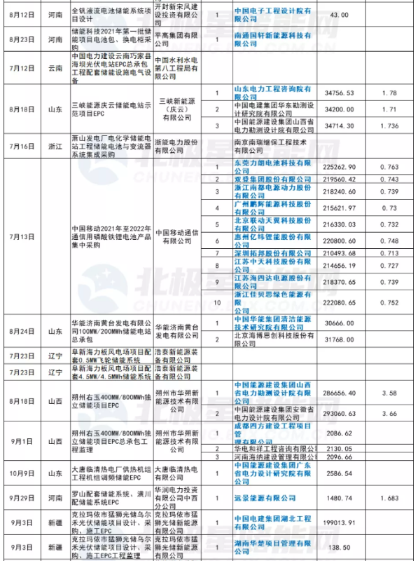 在新能源配套儲能項目中,最有看點的是中核匯能有限公司2021-2022年新能源項目配套儲能系統(tǒng)招標(biāo),共有南瑞繼保、上能電氣、陽光電源、科華數(shù)據(jù)、遠(yuǎn)景能源、智光儲能、欣旺達、上海采日、山東電工電氣、許繼電氣、東方日升、科士達、平高集團、神州數(shù)碼等24家企業(yè)參與投標(biāo)。其中最高報價為中國電力工程顧問集團西北電力設(shè)計院有限公司的44780萬,儲能單價2.17元/Wh,最低報價為中國電建集團華東勘測設(shè)計研究院有限公司的38759.53萬,儲能單價1.88元/Wh,最終神州數(shù)碼、遠(yuǎn)景能源、上能電氣、平高集團獲得中標(biāo)。