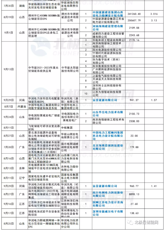 2021年9月,中節(jié)能太陽能股份有限公司2021年度-2023年度儲能系統(tǒng)供應(yīng)商中標(biāo)結(jié)果公示,南瑞繼保、陽光電源、寧德時代、上能電氣、科華數(shù)據(jù)、華為等10家企業(yè)獲得中標(biāo),這也是今年單次招標(biāo)中中標(biāo)企業(yè)最多的一個標(biāo)的。