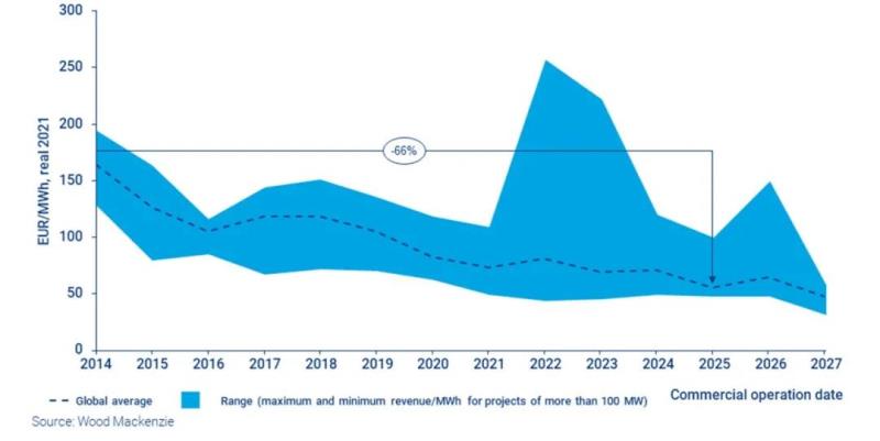 在海上風電連續(xù)六年以“項目中標價格持續(xù)創(chuàng)新低”霸屏后,全新的記錄又產生了。以歐元為單位,2021年投運的海上風電項目,其每兆瓦時項目收益較2014年平均水平下降了55%。根據(jù)最近的中標情況及伍德麥肯茲電價預測,2025年海上風電項目每兆瓦時收益將較2021年再度降低25%。*