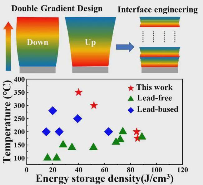 針對這一問題,西安交通大學金屬材料強度國家重點實驗室馬春蕊副教授與微電子學院劉明教授合作,通過選取17 mol% HfO2摻雜BaTiO3、1 mol% SiO2摻雜BaZr0.35Ti0.65O3和0.85BaTiO3-0.15Bi(Mg0.5Zr0.5)O3三種無鉛鈦酸鋇基材料構建了一種應變和介電常數(shù)雙梯度的儲能薄膜電容器。以介電常數(shù)梯度來平衡薄膜中電場的分布,減緩電子在薄膜中的傳輸,提高擊穿強度。以應變梯度來提升高溫區(qū)的介電常數(shù),實現(xiàn)介電常數(shù)寬溫區(qū)內的穩(wěn)定性。在應變和介電常數(shù)雙梯度的協(xié)同作用下,使得無鉛鈦酸鋇基薄膜電容器的工作溫區(qū)提升至350℃,明顯高于現(xiàn)有商業(yè)X8R, X9R電容器的工作溫度。這一設計具有很強的普適性,為進一步提高介電電容器的高溫儲能特性開辟了新的途徑。