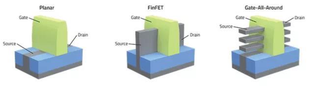 平面晶體管與FinFET以及GAA FET示意圖