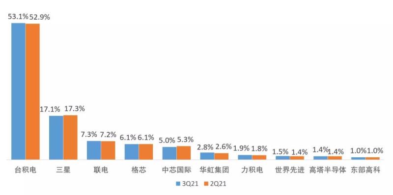 TrendForce:2021第三季全球前十晶圓代工企業(yè)市場份額占比排名