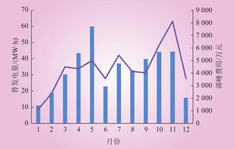 截至2019年年底,西北省間調(diào)峰輔助服務(wù)市場(chǎng)有償調(diào)峰交易6230筆,調(diào)峰電量40.26億kW·h,調(diào)峰費(fèi)用共計(jì)52621.65萬(wàn)元。除此之外,啟停調(diào)峰9臺(tái)次,合計(jì)費(fèi)用1080萬(wàn)元。虛擬儲(chǔ)能目前以甘肅蘭鋁電廠為試點(diǎn),總計(jì)調(diào)峰電量2297.5 MW·h,費(fèi)用11.51萬(wàn)元。全年各月市場(chǎng)交易情況如圖3所示。相比于市場(chǎng)開(kāi)展前,預(yù)計(jì)年度有償調(diào)峰空間為95.81億kW·h。市場(chǎng)開(kāi)展初期,有償調(diào)峰交易電量占預(yù)計(jì)有償調(diào)峰空間的42%左右,說(shuō)明所設(shè)計(jì)的調(diào)峰市場(chǎng)機(jī)制能有效促進(jìn)市場(chǎng)主體挖掘調(diào)峰空間。