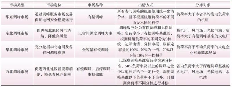 表1從市場(chǎng)定位、市場(chǎng)品種、出清方式、分?jǐn)倢?duì)象對(duì)華東、東北、華北與西北調(diào)峰市場(chǎng)進(jìn)行對(duì)比。