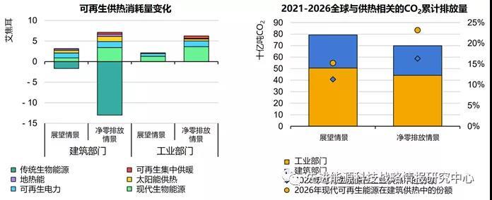 圖9 至2026年全球可再生能源供熱消耗量變化及供熱相關(guān)的CO2累計排放量