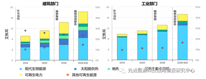 圖8 至2026年建筑部門與工業(yè)部門可再生能源供熱能耗及其在供熱需求中的占比預(yù)測