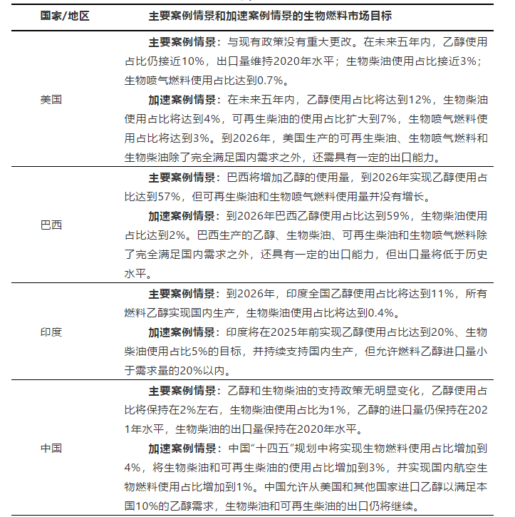 主要案例情景:加拿大將在2022年實施清潔燃料標準;馬來西亞將在2023年開始實施;泰國到2026年前將實現(xiàn)生物燃料使用占比達到15%,其中生物柴油使用占比將增加到10%;新加坡可再生柴油和生物噴氣燃料生產(chǎn)規(guī)模將擴大;阿根廷生物柴油使用占比將維持在5%,乙醇使用占比將增加到12%;哥倫比亞到2022年乙醇使用占比將恢復(fù)到10%,到2026年生物柴油使用占比將維持在10%左右。