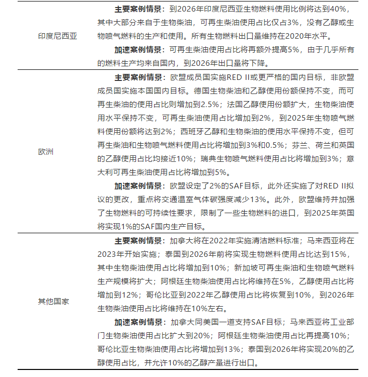 加速案例情景:加拿大同美國一道支持SAF目標;馬來西亞將工業(yè)部門生物柴油使用占比擴大到20%;阿根廷生物柴油使用占比再提高10%;哥倫比亞生物柴油使用占比將增加到13%;泰國到2026年將實現(xiàn)20%的乙醇使用占比,并允許10%的乙醇產(chǎn)量進行出口。