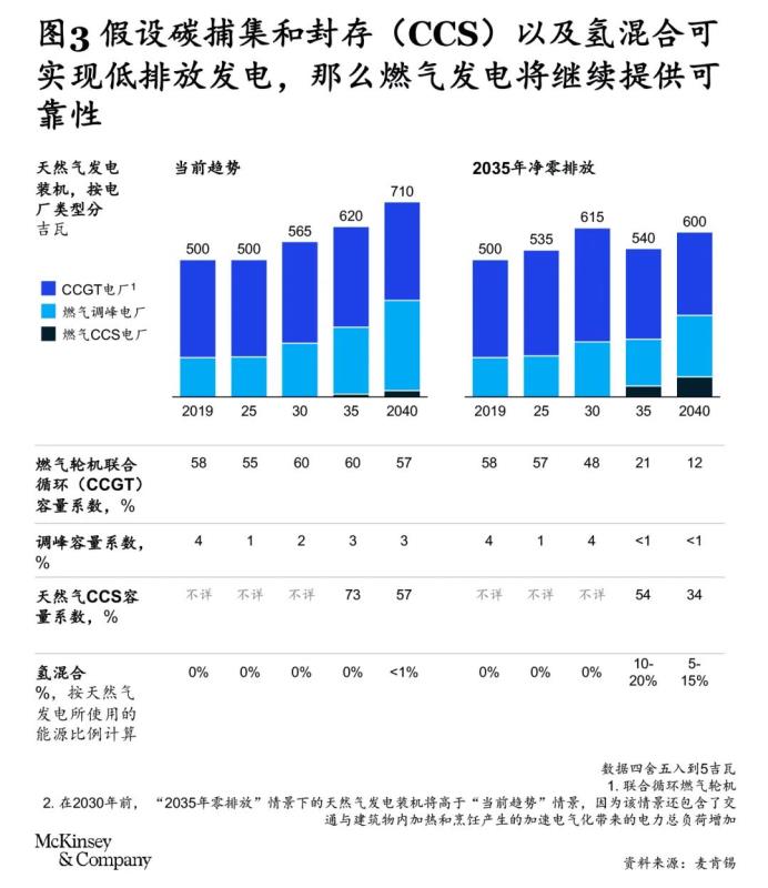 6. 部署可調(diào)度的零碳發(fā)電,包括明確天然氣的角色。在2035年凈零排放情景下,天然氣發(fā)電裝機(jī)量有望持續(xù)增加。這部分增長(zhǎng)既可提供季節(jié)靈活性,又能補(bǔ)齊區(qū)域可再生能源產(chǎn)量較低時(shí)期的缺口,到2035年運(yùn)營(yíng)裝機(jī)將從目前的414吉瓦增加到590吉瓦(見(jiàn)圖3)。只不過(guò)按照凈零排放趨勢(shì),這些燃?xì)怆姀S可能無(wú)法像現(xiàn)在這樣運(yùn)營(yíng)。因此,我們可能需要對(duì)氫、生物甲烷、可再生天然氣和氨等零碳或低碳燃料進(jìn)行組合利用,提供調(diào)峰產(chǎn)能,應(yīng)對(duì)極端天氣下的電力短缺。同時(shí),那些發(fā)電設(shè)備利用小時(shí)數(shù)較高,解決結(jié)構(gòu)性不均衡或季節(jié)性失配的氣電企業(yè),則需要進(jìn)行碳捕集改造。再者,生物能源與碳捕集和封存相結(jié)合(BECCS)可形成負(fù)排放資產(chǎn),雖然運(yùn)營(yíng)成本不菲,但也能為實(shí)現(xiàn)電力凈零排放做出重要貢獻(xiàn)。