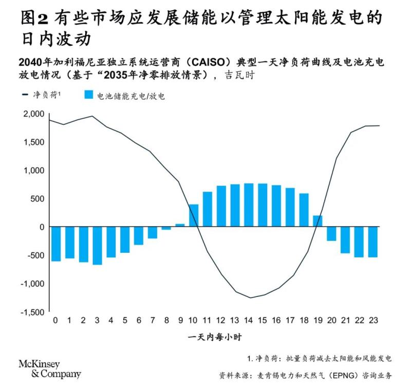3. 提高電網(wǎng)日內(nèi)靈活性。低碳電力行業(yè)的發(fā)電將主要依靠間歇性可再生能源。按每小時(shí)匹配電力供應(yīng)與需求,靈活性資源的部署應(yīng)與低成本可再生能源形成互補(bǔ)(見(jiàn)圖2)。建立300吉瓦以上的短時(shí)響應(yīng)能力才能滿足日內(nèi)電力需求。電網(wǎng)級(jí)儲(chǔ)能,例如鋰電池儲(chǔ)能,在整合可再生能源的同時(shí)還能提高輸電基建設(shè)的利用率。幸運(yùn)的是,截至2020年底,美國(guó)電網(wǎng)互連隊(duì)列中電池儲(chǔ)能已超過(guò)200吉瓦,標(biāo)志著市場(chǎng)正快速增長(zhǎng)?!?】在配電系統(tǒng)內(nèi)周密部署電池儲(chǔ)能,不僅有助于管理電氣化帶來(lái)的電力負(fù)荷大幅波動(dòng),還能強(qiáng)化老舊配電網(wǎng)絡(luò)基礎(chǔ)設(shè)施的韌性和可靠性。此外,需求端抓手的重要性與日俱增,包括實(shí)現(xiàn)交通運(yùn)輸電氣化的充電管理以及采暖及熱水蓄能中的智能建筑能源管理,這兩種做法越來(lái)越受到歡迎。【9】最后,商業(yè)及工業(yè)電力需求響應(yīng)也能發(fā)揮關(guān)鍵作用,可調(diào)度負(fù)荷如雙燃料工業(yè)供熱、高延時(shí)數(shù)據(jù)中心、低谷期抽水蓄能,以及靈活電解制氫等,具有顯著的平衡潛力,同時(shí)又對(duì)終端用戶的財(cái)務(wù)(或?qū)嶋H)影響很小,基本可忽略不計(jì)。