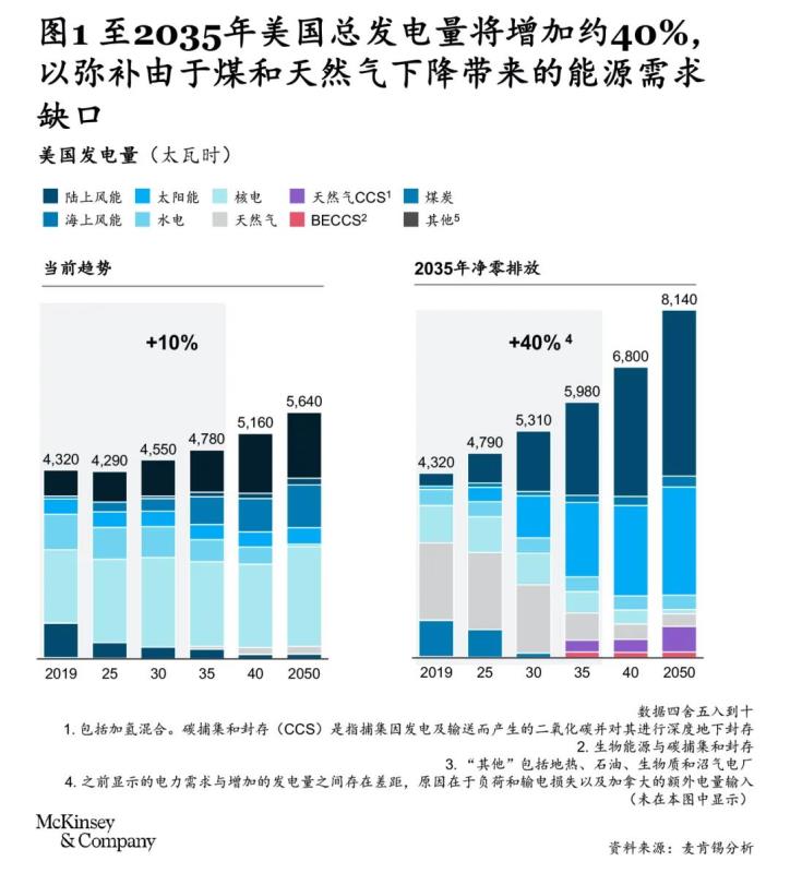 2021年4月,美國(guó)制定了“到2035年實(shí)現(xiàn)零碳污染電力系統(tǒng)”的目標(biāo),這是美國(guó)實(shí)現(xiàn)到2030年碳減排50%~52%、2050年凈零排放的重要內(nèi)容?!?】 麥肯錫研究發(fā)現(xiàn),電力行業(yè)早日實(shí)現(xiàn)大幅碳減排,是通往脫碳經(jīng)濟(jì)眾多路徑的一個(gè)關(guān)鍵因素?!?】在美國(guó)大部分市場(chǎng),太陽(yáng)能、風(fēng)能等可再生能源相比煤和天然氣已經(jīng)具備成本競(jìng)爭(zhēng)力,而且電力減排是推動(dòng)如交通運(yùn)輸(電動(dòng)汽車(chē))、建筑(電力供暖)等其它行業(yè)綠色低碳轉(zhuǎn)型的必備基礎(chǔ)。