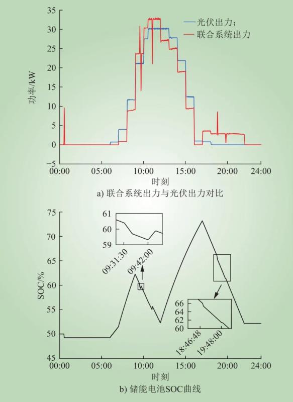 在圖5所示仿真環(huán)境下,依據(jù)本文所提綜合控制策略,光儲(chǔ)系統(tǒng)出力情況如圖6a)所示,儲(chǔ)能電池荷電狀態(tài)如圖6b)所示。