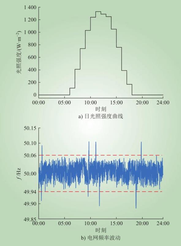 根據(jù)圖1搭建光儲(chǔ)系統(tǒng)仿真模型。其中光伏電池滿發(fā)功率為30 kW,儲(chǔ)能電池額定容量為300 A·h,額定參考功率為10 kW,逆變器容量為30 kW,且有10%的過載能力,即逆變器最大功率為33 kW。設(shè)置 SOCmax=95% , SOCmin=5% ,考慮到一天中儲(chǔ)能電池在調(diào)頻模式下動(dòng)作時(shí)間短,設(shè)置調(diào)頻預(yù)留容量為儲(chǔ)能電池容量的10%,即 SOChigh=85% , SOClow=15% 。設(shè)置典型日環(huán)境溫度為25 °C ,日光照強(qiáng)度曲線如圖5a)所示,電網(wǎng)頻率波動(dòng)如圖5b)所示。