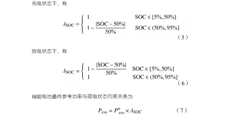 在保證不過充/過放的前提下,儲(chǔ)能電池根據(jù)電網(wǎng)頻率的偏移方向進(jìn)行充放電,設(shè)置儲(chǔ)能電池在調(diào)頻模式下的初級參考功率與荷電狀態(tài)約束為