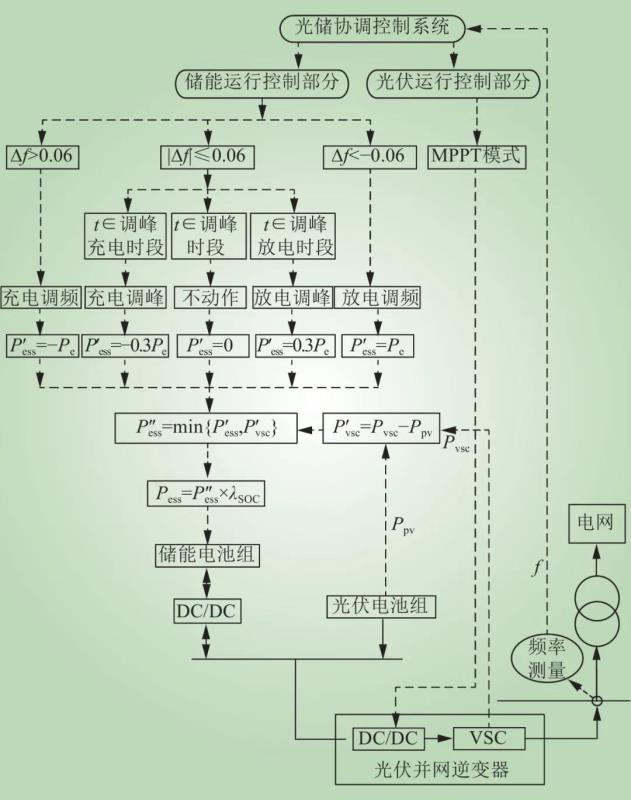 根據(jù)電網(wǎng)頻率不同,儲(chǔ)能電池可工作于調(diào)頻/調(diào)峰2種工作模式。在這2種模式下,光儲(chǔ)系統(tǒng)的控制包括3個(gè)主要環(huán)節(jié):(1)光伏系統(tǒng)采用最大功率跟蹤(maximum power point tracking, MPPT)控制,光儲(chǔ)協(xié)調(diào)控制系統(tǒng)檢測電網(wǎng)頻率,判定頻率是否處于調(diào)頻死區(qū)。(2)電網(wǎng)頻率處于調(diào)頻死區(qū)內(nèi)時(shí),儲(chǔ)能電池運(yùn)行于調(diào)峰模式,此時(shí)依據(jù)調(diào)峰時(shí)段,控制儲(chǔ)能電池充放電;電網(wǎng)頻率超出調(diào)頻死區(qū)時(shí),儲(chǔ)能電池運(yùn)行于調(diào)頻模式,根據(jù)頻率偏移方向得到儲(chǔ)能電池初級參考功率。(3)與逆變器空閑容量比較,取兩者中較小值作為儲(chǔ)能電池次級參考功率,經(jīng)儲(chǔ)能電池最大出力約束系數(shù)優(yōu)化后作為儲(chǔ)能電池最終參考功率。得到綜合控制策略流程如圖2所示。