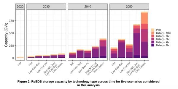 儲(chǔ)能發(fā)電容量從213GW到932GW不等,平均持續(xù)時(shí)間從4.7到6.5小時(shí)不等。