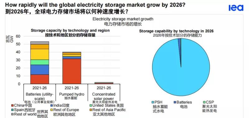 在系統(tǒng)靈活性需求的推動(dòng)下,全球存儲(chǔ)容量擴(kuò)大了56%。由于報(bào)酬計(jì)劃和長(zhǎng)期目標(biāo),中國(guó)在所有技術(shù)的擴(kuò)張中占主導(dǎo)地位。抽水蓄能電站(PSH)仍然是存儲(chǔ)能力的最大來(lái)源。