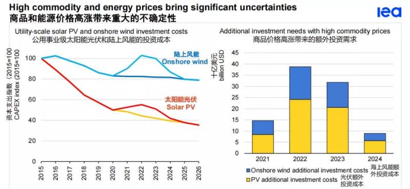 太陽(yáng)能光伏發(fā)電站和風(fēng)力發(fā)電站的較高價(jià)格對(duì)預(yù)期設(shè)備價(jià)格會(huì)持續(xù)下降的贏得競(jìng)爭(zhēng)性拍賣的開(kāi)發(fā)商構(gòu)成了特別的挑戰(zhàn)。如果商品價(jià)格在2022年之前一直居高不下,那么太陽(yáng)能三年和風(fēng)能五年的成本降低就會(huì)被抹去。增加的成本將需要超過(guò)1000億美元的額外投資來(lái)安裝相同數(shù)量的容量。 這相當(dāng)于將今天的全球可再生能源發(fā)電能力的年度投資增加約1/3。