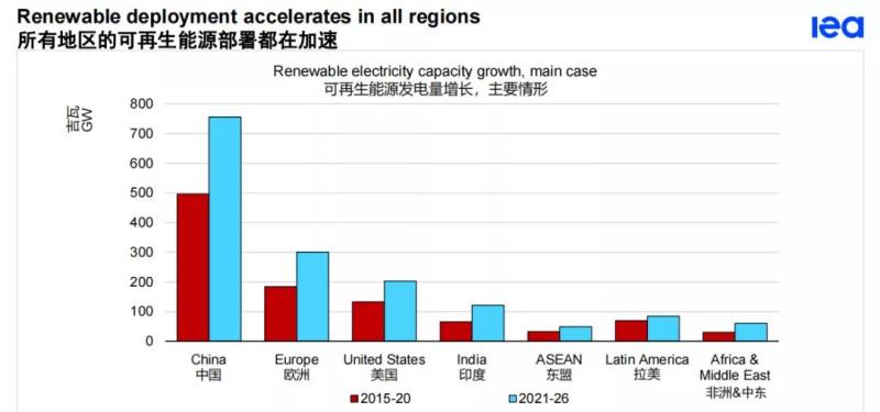 總的來(lái)說(shuō),中國(guó)在未來(lái)五年內(nèi)仍然是領(lǐng)導(dǎo)者,占全球可再生能源容量增長(zhǎng)的43%,其次是歐洲、美國(guó)和印度。僅這四個(gè)市場(chǎng)就占了全球可再生能源容量擴(kuò)張的80%。