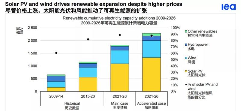預(yù)計(jì)未來(lái)五年可再生能源容量的增長(zhǎng)將加速,到2026年將占全球電力容量增長(zhǎng)的近95%。我們已經(jīng)上調(diào)了一年前的預(yù)測(cè),因?yàn)楦辛Φ恼咧С趾蜑镃OP26宣布的雄心勃勃的氣候目標(biāo)超過(guò)了目前創(chuàng)紀(jì)錄的商品價(jià)格,后者增加了建設(shè)新的風(fēng)能和太陽(yáng)能光伏設(shè)施的成本。在全球范圍內(nèi),可再生能源發(fā)電量在2020年至2026年期間預(yù)計(jì)將增加60%以上,達(dá)到4800萬(wàn)千瓦以上。這相當(dāng)于目前全球化石燃料和核能發(fā)電量的總和。