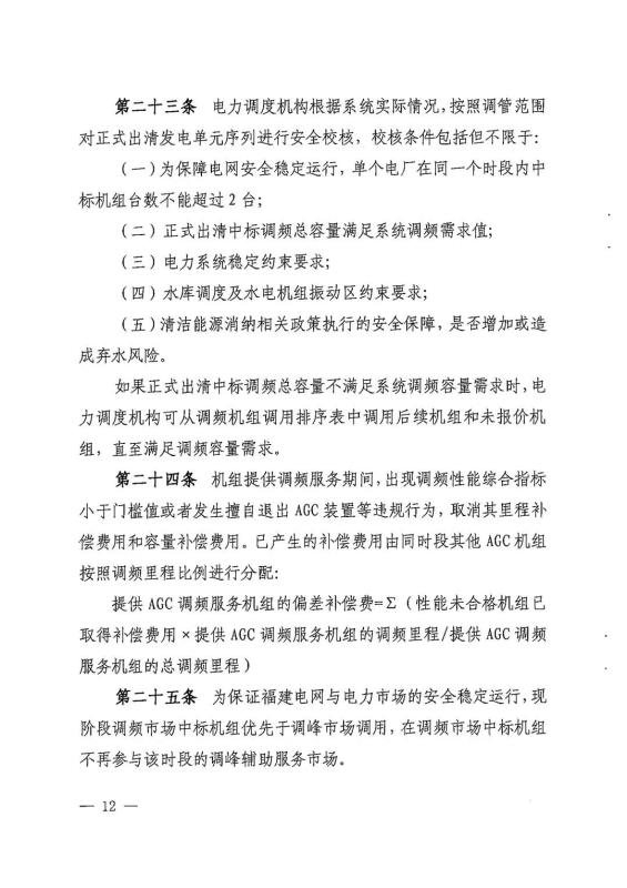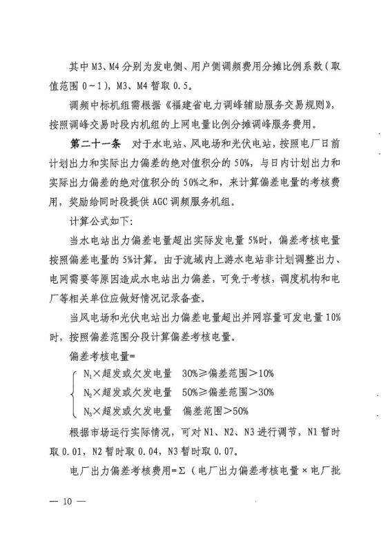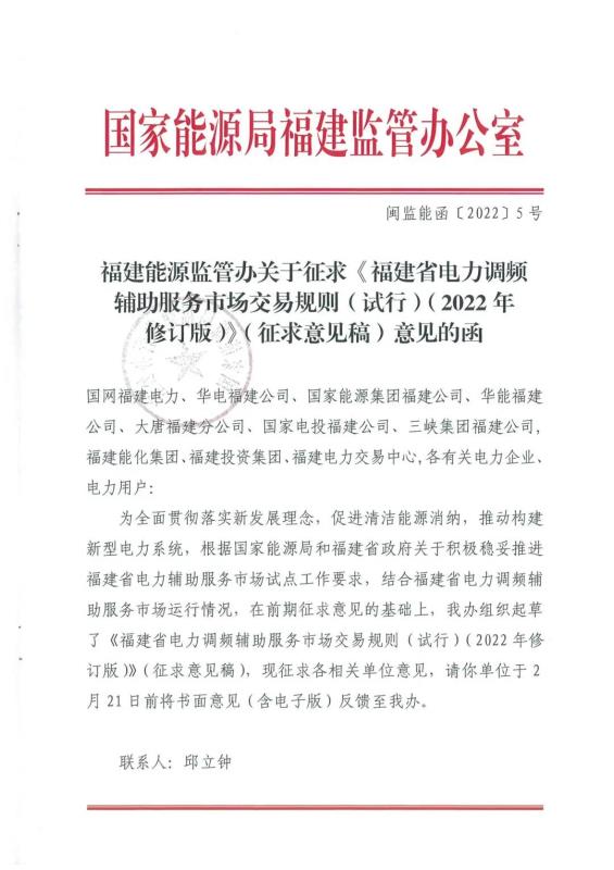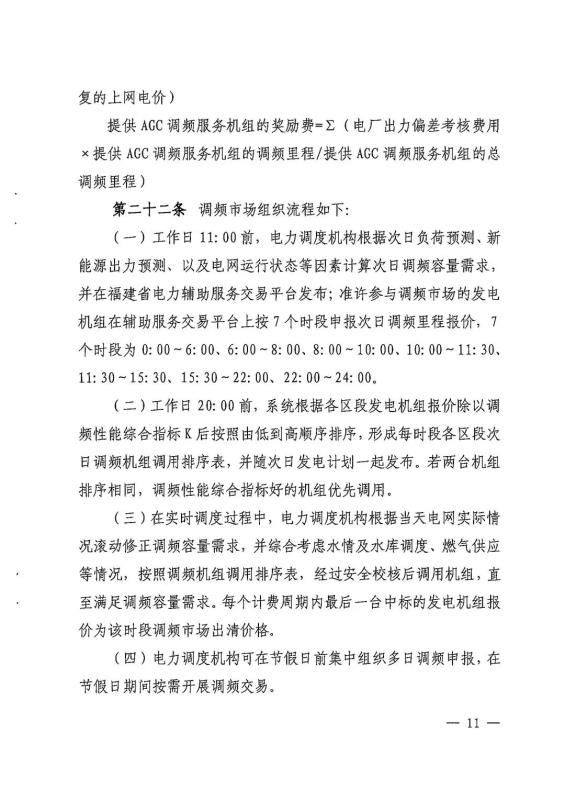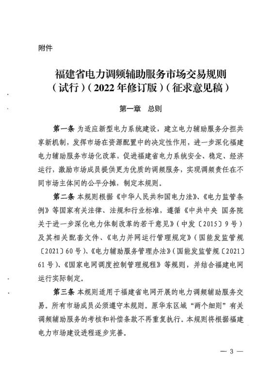 中國(guó)儲(chǔ)能網(wǎng)訊:1月21日,福建能監(jiān)辦發(fā)布關(guān)于征求《福建省電力調(diào)頻輔助服務(wù)市場(chǎng)交易規(guī)則(試行)(2022年修訂版)》(征求意見稿)意見的函,修訂版中綜合調(diào)頻性能指標(biāo)不低于0.55,儲(chǔ)能電站可作為調(diào)頻服務(wù)主體,但要求不小于10MW,快速地區(qū)報(bào)價(jià)上限12元/MW,慢速地區(qū)報(bào)價(jià)上限16元/MW。