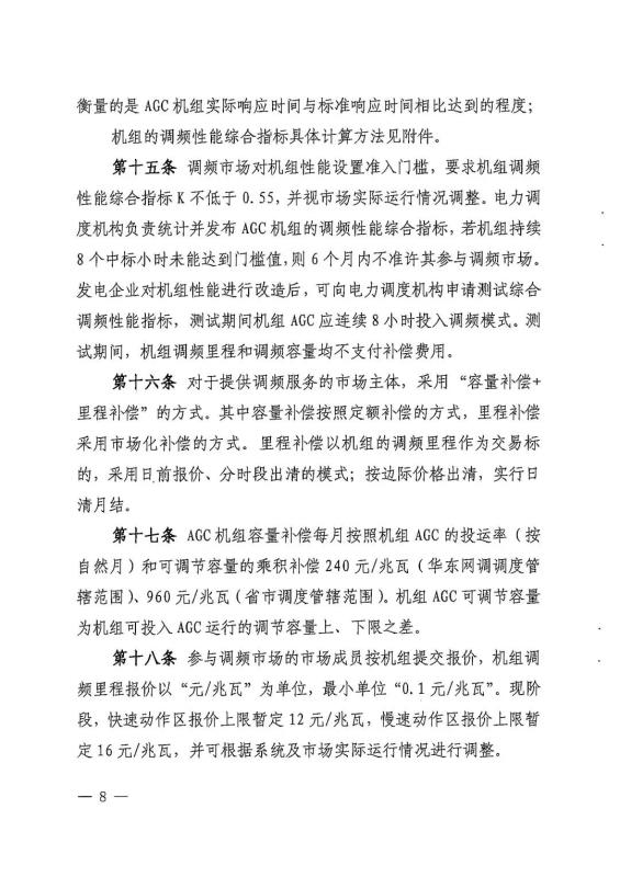 在2019年版文件要求綜合調(diào)頻性能指標(biāo)不低于0.53,參與調(diào)頻市場(chǎng)的報(bào)價(jià)上限12元/MW。此次文件對(duì)調(diào)頻性能指標(biāo)與報(bào)價(jià)上線都有提升。