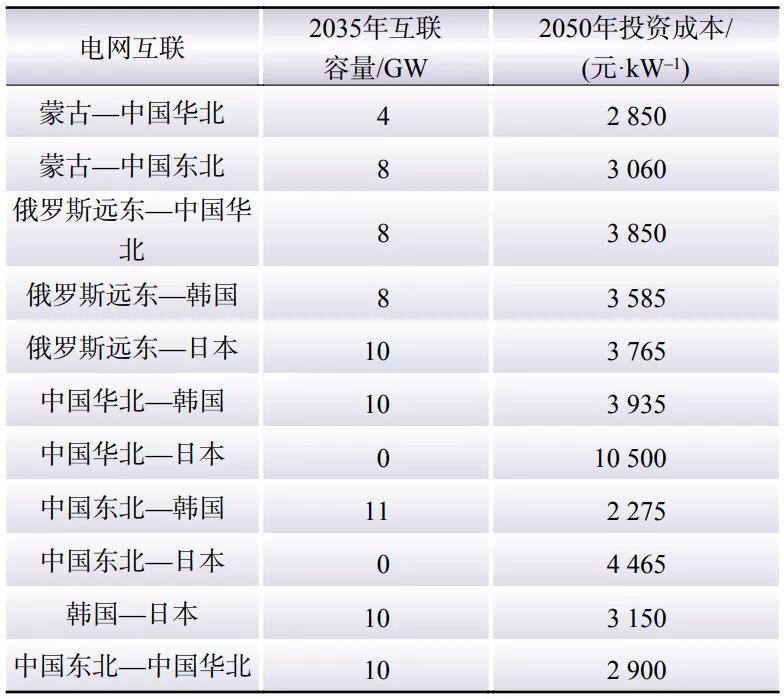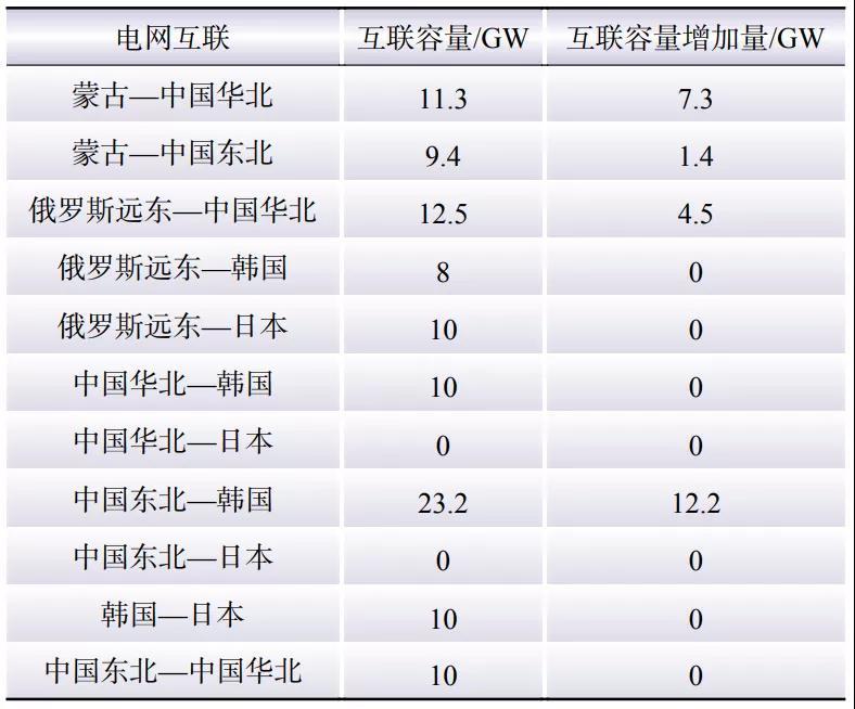 (3)在情景0優(yōu)化結(jié)果的基礎(chǔ)上,增加送受端系統(tǒng)之間的電網(wǎng)互聯(lián)容量,作為新的邊界條件,重新優(yōu)化東北亞6區(qū)域的新能源、電網(wǎng)和儲(chǔ)能容量,論述電網(wǎng)互聯(lián)布局和容量規(guī)劃問題,形成情景2。
