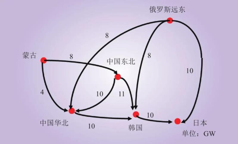 電網(wǎng)互聯(lián)和成本方面,東北亞6區(qū)域2035年的電網(wǎng)互聯(lián)結(jié)構(gòu)和容量、2050年電網(wǎng)單位投資成本如表6所示。電網(wǎng)布局及送受電特性示意如圖1所示,總體來看,蒙古和俄羅斯遠(yuǎn)東為送端系統(tǒng),韓國(guó)、日本為受端系統(tǒng),根據(jù)各區(qū)域電網(wǎng)的送受電特性對(duì)2050年新建電網(wǎng)互聯(lián)容量進(jìn)行優(yōu)化規(guī)劃。