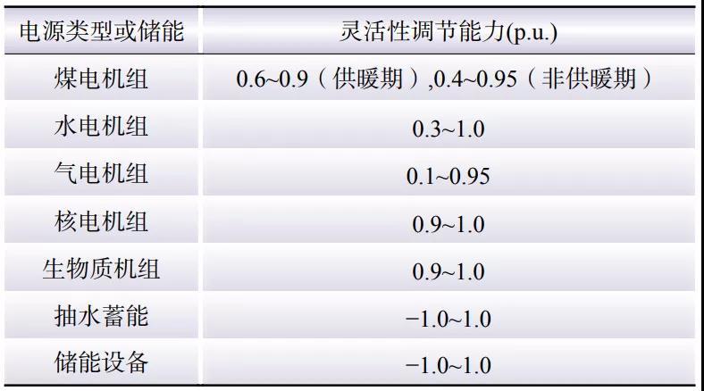 表4 不同類型電源及儲(chǔ)能的靈活調(diào)節(jié)能力