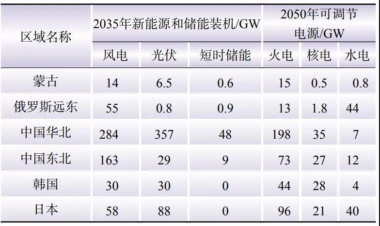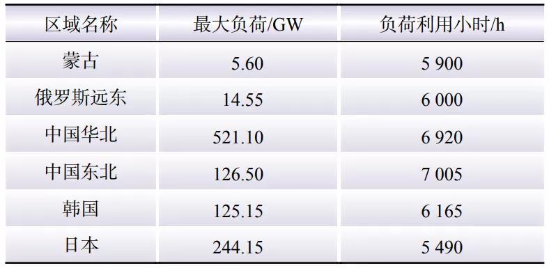 負(fù)荷方面,基于東北亞蒙古、俄羅斯遠(yuǎn)東、中國(guó)華北、中國(guó)東北、韓國(guó)、日本6大區(qū)域2050年的最大負(fù)荷預(yù)測(cè)(見表1)和歷史負(fù)荷特性,得到6大區(qū)域2050年的全年逐小時(shí)負(fù)荷特性曲線。