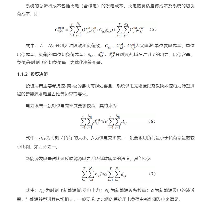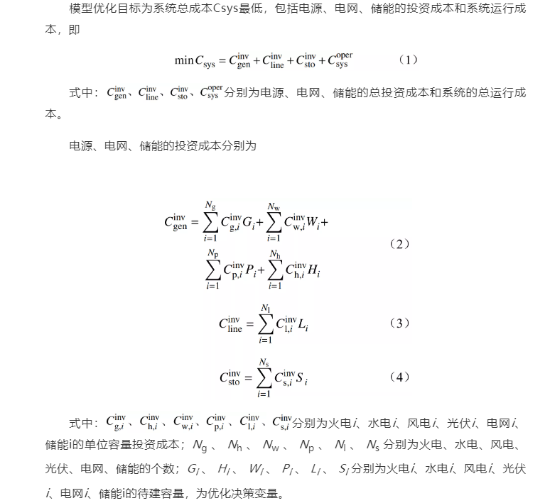 (3)在優(yōu)化計(jì)算和分析模塊,開展全年時(shí)序生產(chǎn)運(yùn)行模擬,保證系統(tǒng)供電充裕度和電力電量平衡,達(dá)到系統(tǒng)總成本最低。優(yōu)化求解新增的風(fēng)電、光伏新能源電源裝機(jī)、電網(wǎng)互聯(lián)及儲(chǔ)能容量,分析新能源電源、互聯(lián)電網(wǎng)及儲(chǔ)能三者之間的關(guān)系。