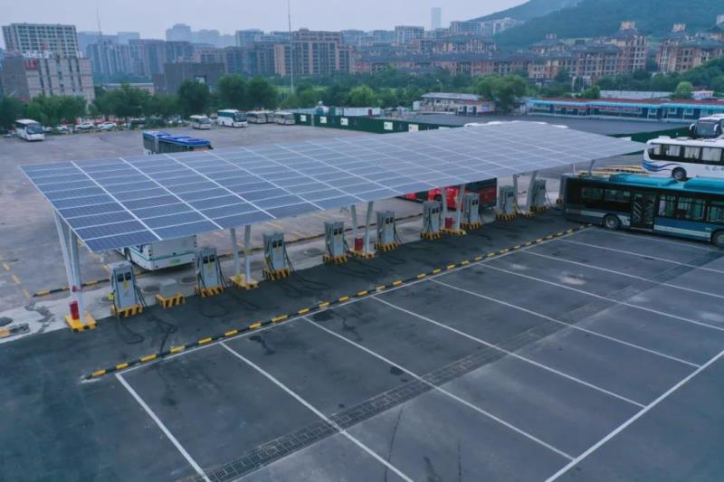 2021年8月22日,濟南公交媒體村公交充電站光伏雨棚全景,該光伏雨棚既能發(fā)電,又可以擋雨,綠色電源還為公交車進行充電。