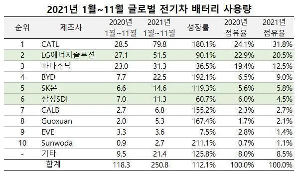 2021年1~11月全球動(dòng)力電池裝機(jī)量排行榜