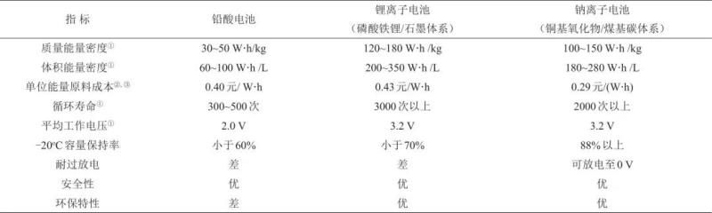 表1 鉛酸電池、鋰離子電池和鈉離子電池性能對比