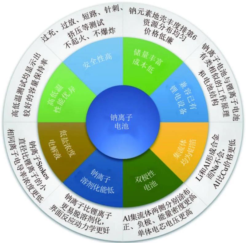 鈉離子電池的優(yōu)勢大致有以下幾個(gè)方面:①鈉資源儲量豐富,分布均勻,成本低廉;②鈉離子電池與鋰離子電池的工作原理相似,與鋰離子電池的生產(chǎn)設(shè)備大多可兼容;③由于鋁和鈉在低電位不會發(fā)生合金化反應(yīng),鈉離子電池正極和負(fù)極的集流體都可使用廉價(jià)的鋁箔;④在固態(tài)電池中,可設(shè)計(jì)雙極性電極,在同一張鋁箔兩側(cè)分別涂布正極和負(fù)極材料,將這樣的極片周期堆疊,在一個(gè)單體電池中實(shí)現(xiàn)更高電壓,并可節(jié)約其他非活性材料以提高體積能量密度;⑤鈉離子的溶劑化能比鋰離子更低,即具有更好的界面離子擴(kuò)散能力;⑥鈉離子的斯托克斯直徑比鋰離子的小,相同濃度的電解液具有比鋰鹽電解液更高的離子電導(dǎo)率,或者更低濃度電解液可以達(dá)到同樣離子電導(dǎo)率;⑦根據(jù)目前初步的高低溫測試結(jié)果,鈉離子電池高低溫性能更優(yōu)異;⑧在所有安全項(xiàng)目測試中,均未發(fā)現(xiàn)起火現(xiàn)象,安全性能更好。鈉離子電池的內(nèi)阻相比鋰離子電池要稍微高一點(diǎn),致使在短路等安全性試驗(yàn)中瞬間發(fā)熱量少、溫升較低,這是安全性能好的原因之一。更多鈉離子電池特有的優(yōu)勢還會隨著研究的深入逐漸顯示出來,挖掘這些特有優(yōu)勢將提高鈉離子電池產(chǎn)品差異化,使其在未來市場競爭中占據(jù)有利地位。