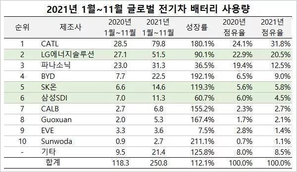 數(shù)據(jù)顯示,2021年1-11月,寧德時代以31.8%的市占率穩(wěn)坐全球第一把交椅;LG新能源位列其次,市占率為20.5%;三、四名分別是松下和比亞迪,CR4合計霸占了超70%的市場。