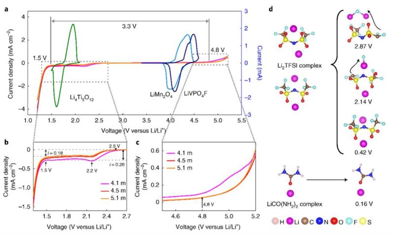 同時,高濃鹽本身也帶來了成本提高、電解液粘度增加等問題。于是,團(tuán)隊便反其道而行,考慮降低鹽濃度,并提高電解液電壓窗口的辦法,這項最新發(fā)表的成果就是基于這個思路做出來的。