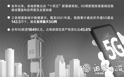事實(shí)上,去年以來,多地密集出臺“十四五”新基建規(guī)劃,5G等新型信息基礎(chǔ)設(shè)施建設(shè)覆蓋和應(yīng)用普及全面加速。工信部最新統(tǒng)計(jì)數(shù)據(jù)顯示,截至2021年底,我國累計(jì)建成并開通5G基站142.5萬個(gè),建成全球最大5G網(wǎng)。全年5G投資1849億元,占電信固定資產(chǎn)投資比達(dá)45.6%。