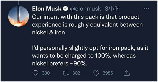 馬斯克也稱自己更喜歡磷酸鐵鋰電池,他表示: