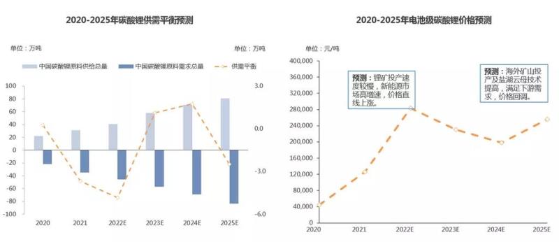 根據SMM測算,未來五年,中國碳酸鋰市場難以平衡。2021-2022年, 中國碳酸鋰供給受限于海外資源產能,2022年將呈現約7%的供應缺口,全年均價將出現大幅上行。2023-2024年,海外礦山、鹽湖新擴建項目基本投產完畢,預期鋰資源供應得到及時補足,國內鋰鹽廠商將維持高開工率,而鋰最大的下游市場,新能源汽車市場增速預期不及初期爆發(fā)期,供給邊際增長將超過需求,預計碳酸鋰市場將再次進入短暫的下跌階段。2025年,全球儲能市場大幅爆發(fā),新能源汽車銷量高漲至1,800萬輛,鋰資源需求明顯上漲,2025年全球鋰資源計劃生產項目或將進一步面臨瓶頸,缺口重現,價格上漲。而在海外資源管控逐漸加強,未來中國資源供給也將面臨風險及挑戰(zhàn)。